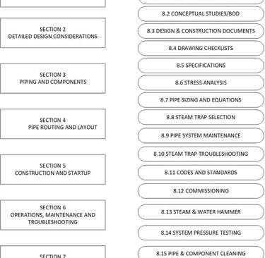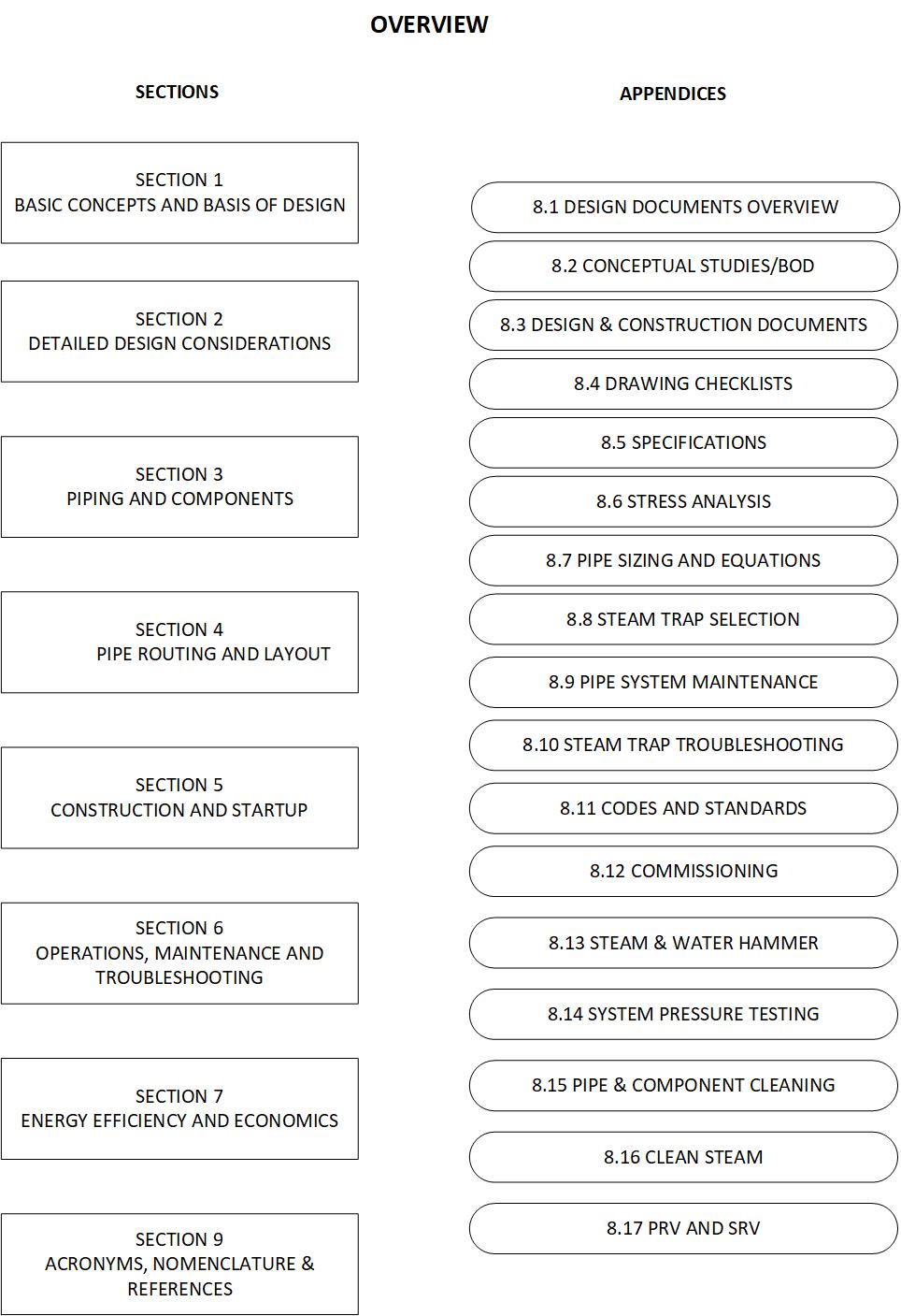 The second section goes into greater detail and depth on the design of steam and condensate systems. Input and guidance is provided on the development of the overall design, from initial studies and BOD to the detailed design documents. Topics include pipe sizing and routing, Pressure Reducing Valves (PRVs), Safety Relief Valves (SRVs) and other design considerations based upon the size and complexity of the systems.